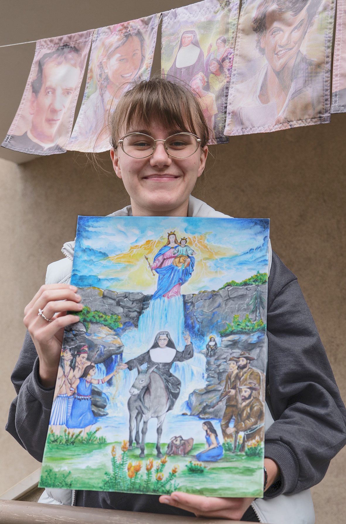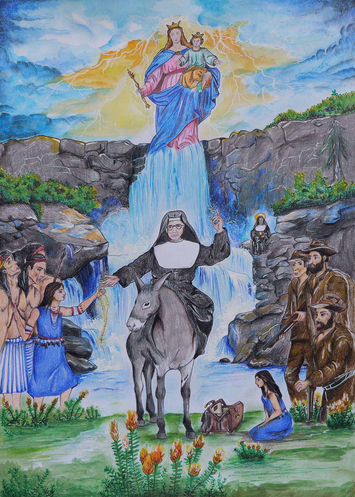 Delante de ellas se encuentra una flor de Chuquiraga, símbolo de Ecuador, que representa el amor puro y la resiliencia de la gente de esa tierra. María Troncatti es proclamada Santa como la primera hermana de la Congregación de las Hijas de María Auxiliadora después de Santa María Doménica Mazzarello. María Mazzarello fue una madre espiritual para las jóvenes, para las hermanas, que las animó siempre, y continúa siguiéndonos hoy con su intercesión. Está representada sentada en una roca cerca de una cascada, observando a María Troncatti. Mira cómo trabaja para Dios, para la salvación de las almas, y la sigue con sus oraciones en el Cielo.