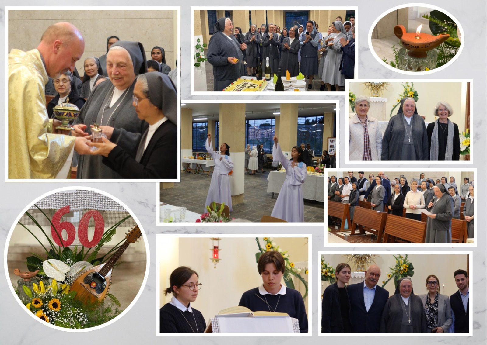 Dès la veille, les lieux communautaires étaient prêts, ornés de couleurs, de paroles, de gestes d’affection et de reconnaissance envers le Seigneur pour sa fidélité, et envers Mère Yvonne pour ses 60 ans de persévérance généreusement donnés à l’Institut.