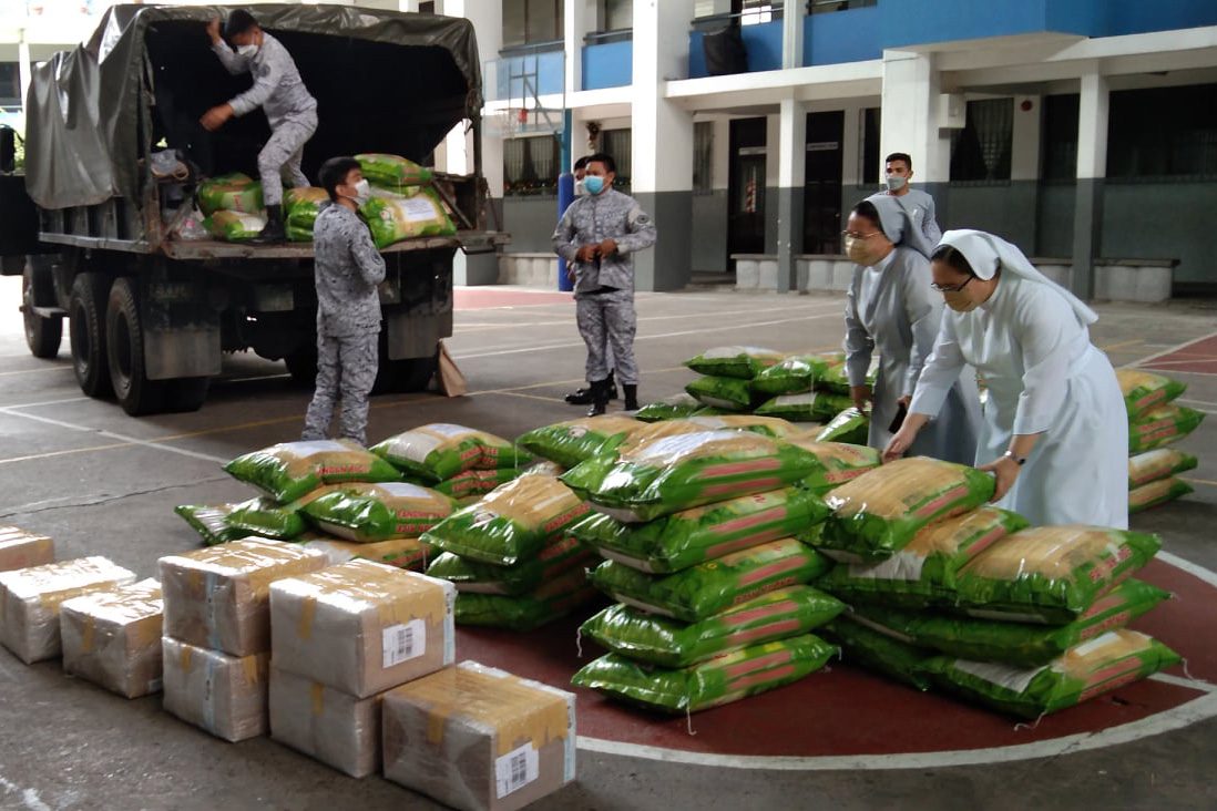 Le 4 janvier 2022, dans la Dom Bosco School de la Communauté Saint Jean Bosco de Manille, des hommes des Forces Armées des Philippines, avec l’aide du personnel de l’Ecole, ont chargé deux camions de l’armée avec 3500kg de nourriture et d’eau, à envoyer à Cebu par un bateau de la Marine des Philippines.