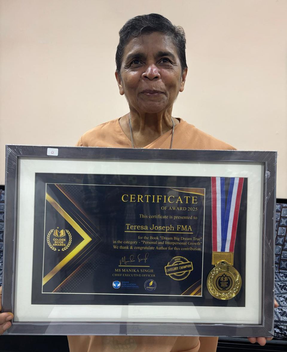 Mumbai (Inde). Le 31 janvier 2025, sœur Teresa Joseph, Fille de Marie Auxiliatrice de la Province indienne Ste Maria Mazzarello (INB), a reçu le Golden Book Award 2025 – dans la catégorie ‘’Croissance personnelle et interpersonnelle’’ pour son livre ‘’Dream Big Dream True’’ – 35 tips to make de best of your life’’ (Rêver grand et rêver pour de vrai – 35 conseils afin de vivre au mieux votre vie).
