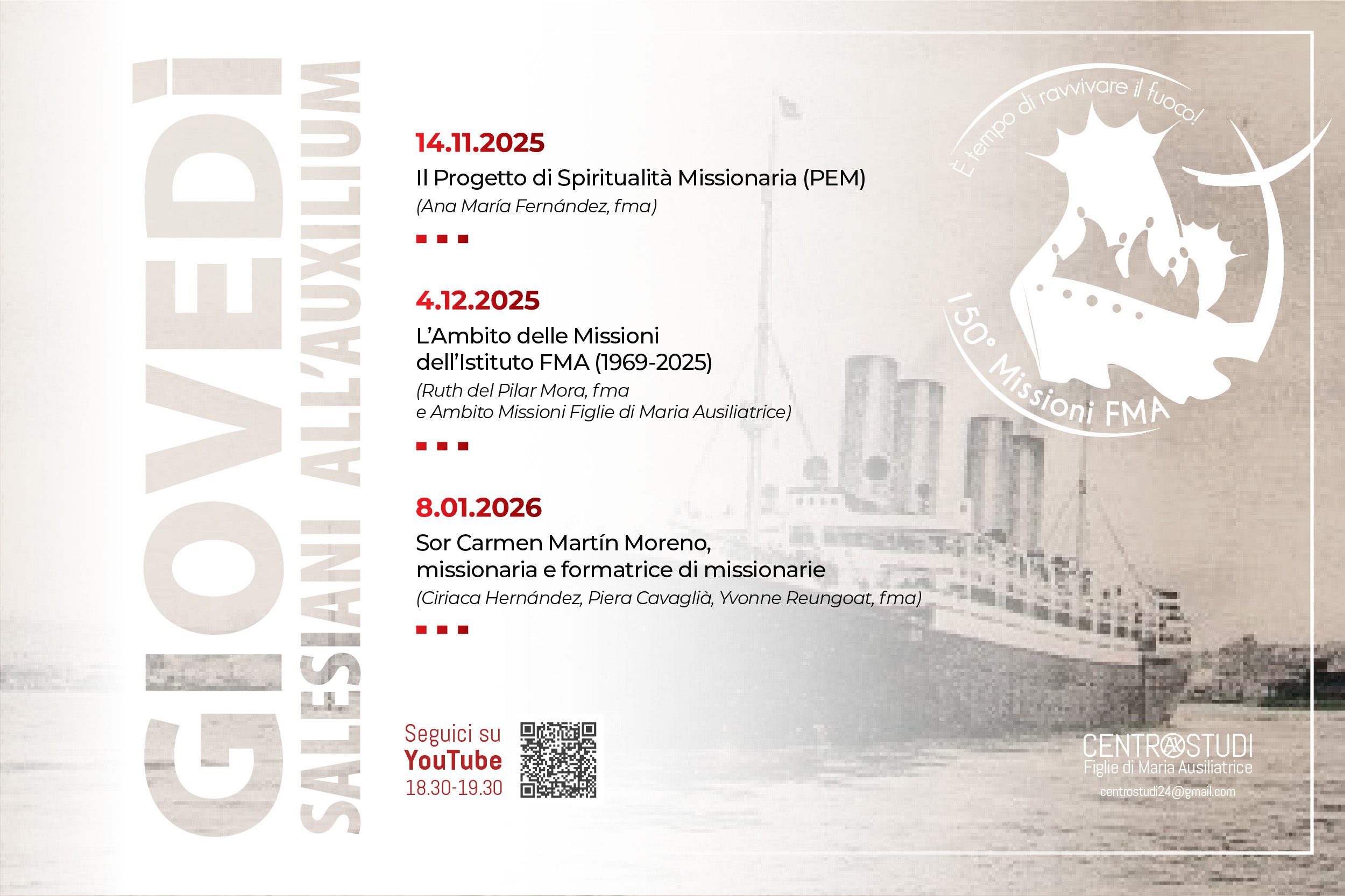 Il primo, il 14 novembre (venerdì e non giovedì), è dedicato alla presentazione, a cura di suor Ana María Fernández, FMA dell’Ispettoria Laura Vicuña (ARG), del Progetto di Spiritualità Missionaria (PEM) che offrirà un percorso online (marzo-novembre 2026) attraverso diversi luoghi del Cono Sud dell’America, dove si diffusero le prime attività e proposte educative tra i migranti e le popolazioni indigene; il 4 dicembre la Consigliera dell’Ambito per le Missioni, duor Ruth del Pilar Mora, presenterà l’animazione missionaria maturata nell’Istituto dopo il Concilio Vaticano II e sviluppata dalle diverse Consigliere e collaboratrici, in modo da saldare la storia delle origini con il presente; l’8 gennaio 2026 sarà presentata la figura di una missionaria e Consigliera generale, formatrice di missionaria, ovvero suor Carmen Martín Moreno.