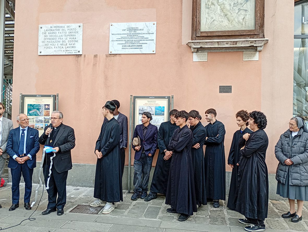 Prima di partire verso l’Opera salesiana nel quartiere di Sampierdarena, proprio nella zona del Porto Antico, accompagnati da dieci giovani che impersonavano i primi missionari, c’è stato un primo momento ufficiale di rievocazione alla presenza delle autorità civili ed ecclesiastiche con lo svelamento di una lapide commemorativa di quella prima partenza. Le parole di tutti gli intervenuti, autorità civili ed ecclesiali, hanno richiamato in particolare il forte legame della città di Genova con Don Bosco. Ringraziando per l’accoglienza della presenza salesiana in tutti questi anni, il Rettor Maggiore ha ricordato i tre verbi che accompagnano questa grande ricorrenza: “prima di tutto fare memoria e ringraziare il Signore per quello che abbiamo vissuto, però anche ripensare a cosa vuol dire tutta questa eredità che abbiamo ricevuto, per poter rilanciare non tanto l’attività missionaria per se stessa, ma come attenzione alla nuove povertà, sia nei Paesi che hanno bisogno, ma anche nelle nostre realtà”.