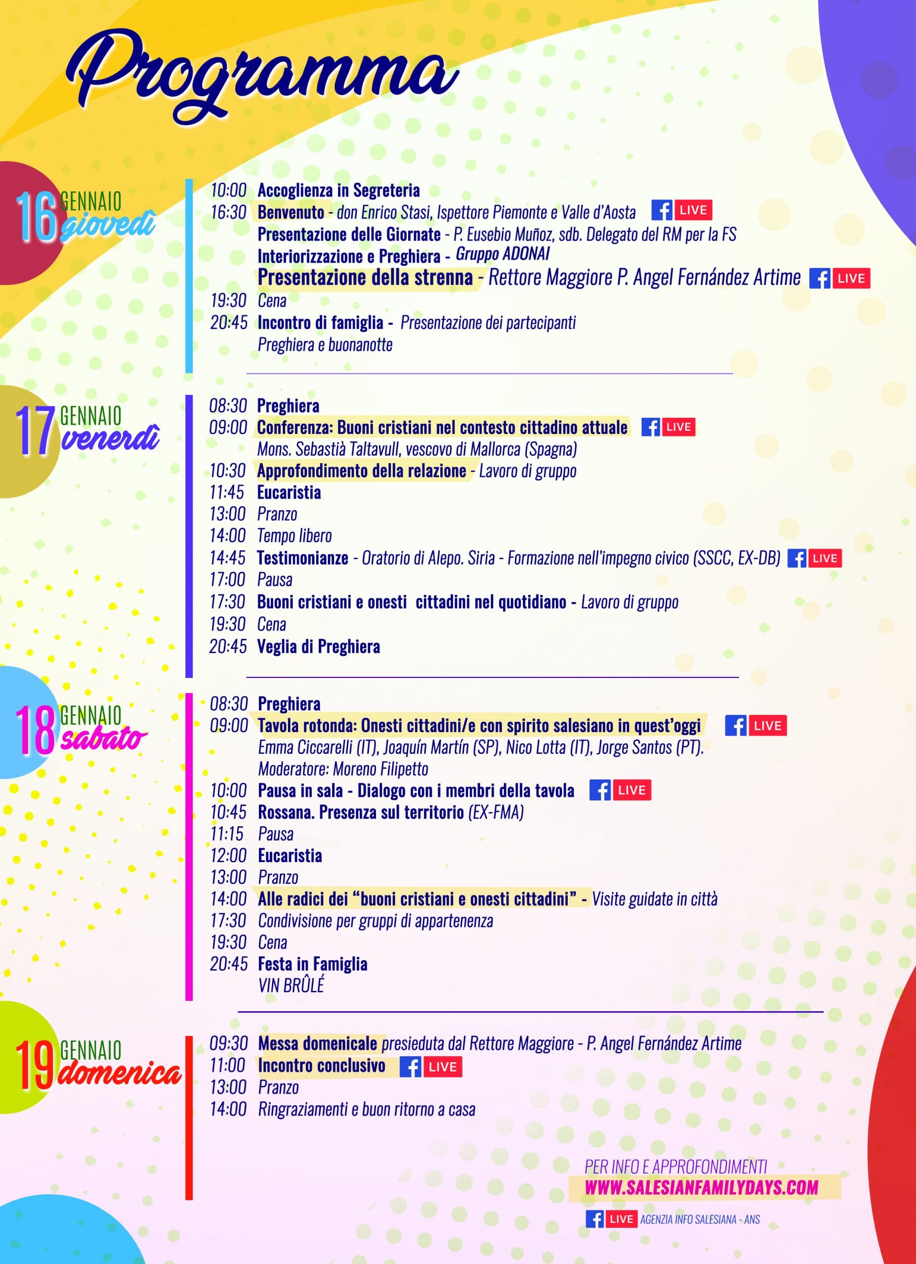 I momenti salienti delle Giornate – l’apertura e la Presentazione della Strenna, la Conferenza “Buoni cristiani nel contesto cittadino attuale”, che sarà tenuta da Mons. Sebastià Taltavull, vescovo di Mallorca (Spagna), le Testimonianze dall’oratorio salesiano di Aleppo (Siria) e di alcuni Salesiani Cooperatori ed Ex-allievi di Don Bosco, la Tavola rotonda “Onesti cittadini/e con spirito salesiano in quest’oggi” e l’incontro finale con il messaggio conclusivo del Rettor Maggiore – verranno trasmessi in diretta streaming attraverso la pagina Facebook dell’Agenzia Info Salesiana ANS.
