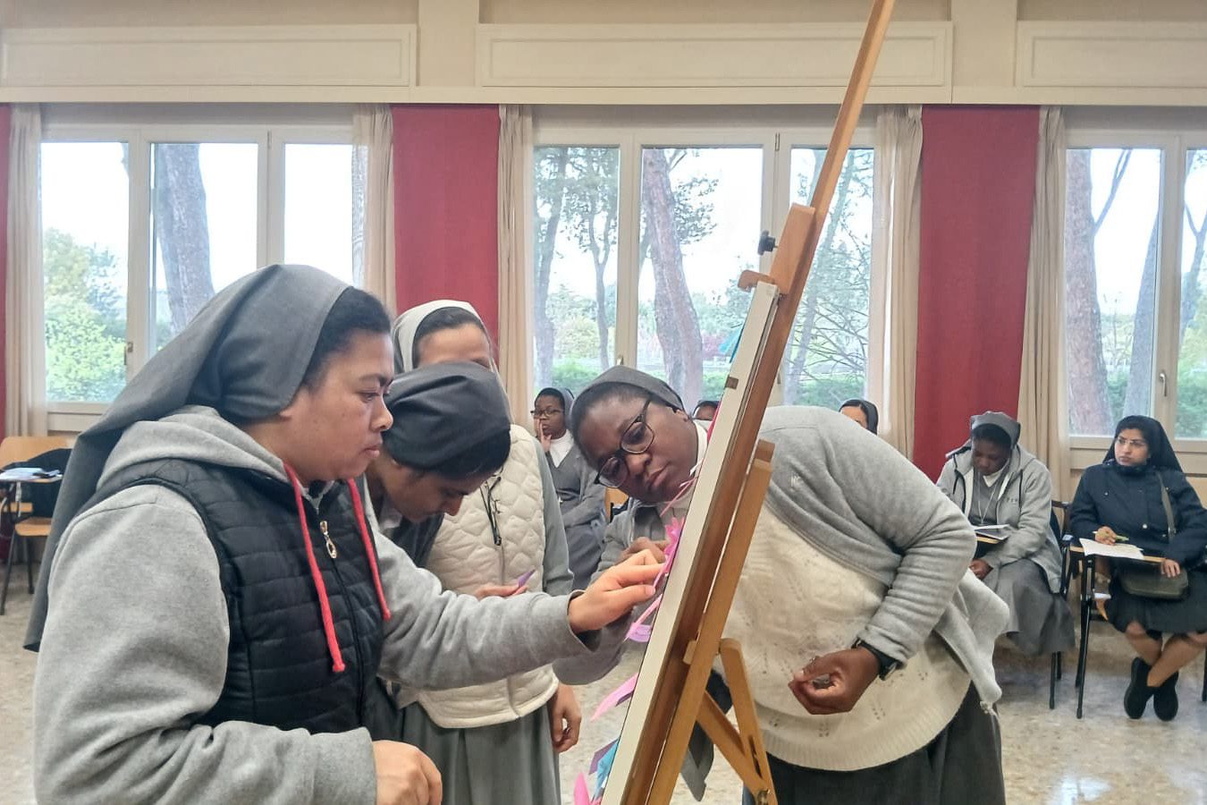 Il secondo momento è stato dedicato alla memoria della prima chiamata vocazionale. Mediante alcune domande, ciascuna ha ripercorso il primo ricordo della chiamata: luoghi, persone, emozioni, parole che hanno segnato l’inizio del cammino. Sono emerse la gioia dei primi passi, talvolta accompagnata da timore, e l’immagine di Dio percepita allora come presenza che chiama, sostiene e sfida. Si è riconosciuto ciò che rimane vivo del primo “sì”: i volti che sono stati dono nel cammino, i segni concreti della fedeltà di Dio e le fragilità che sono diventate luogo di misericordia. È stato sottolineato che la maturità vocazionale nasce dal passaggio dal “mi ha chiamata” al “io scelgo ancora”, dalla meraviglia iniziale alla responsabilità quotidiana di rinnovare la propria risposta.