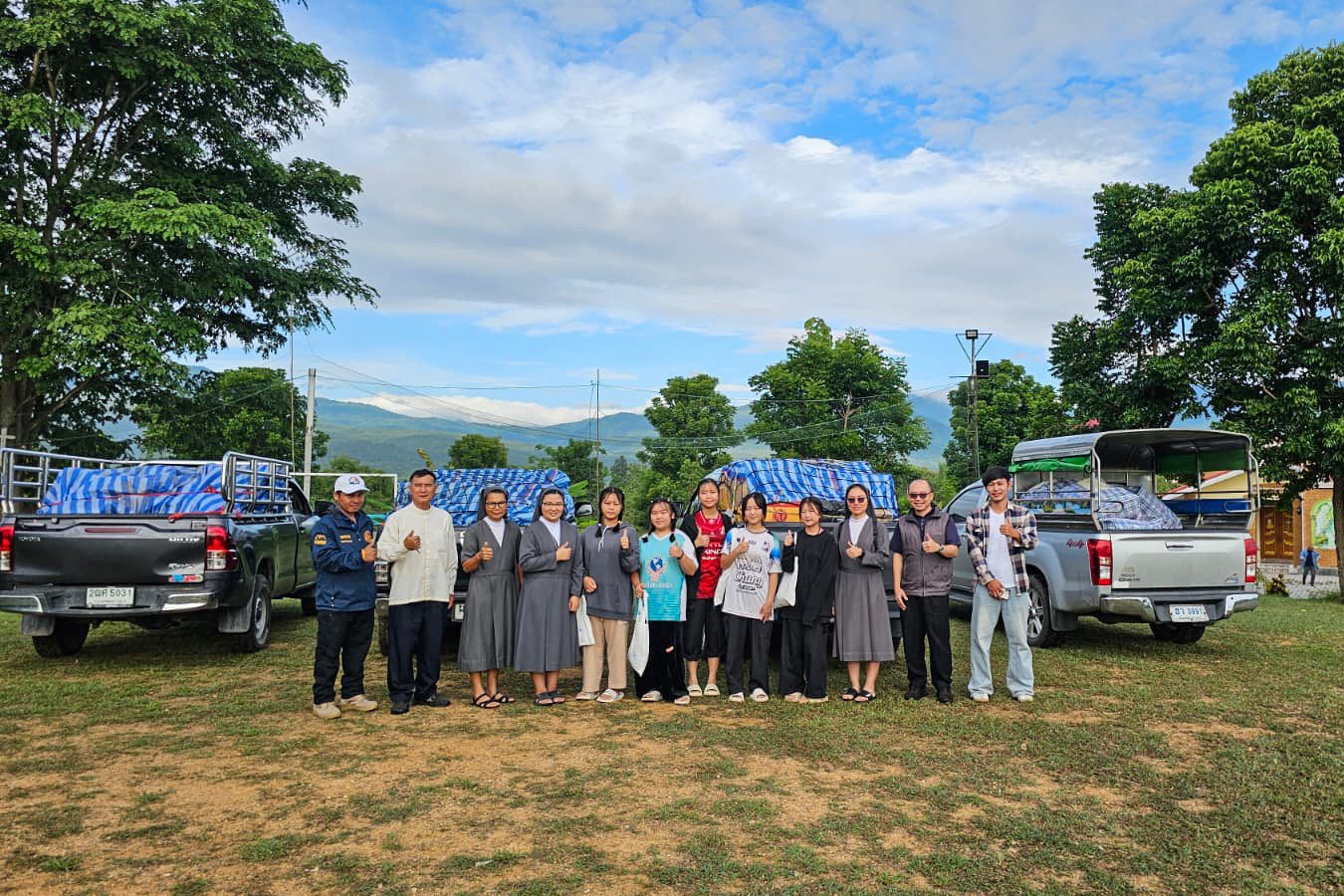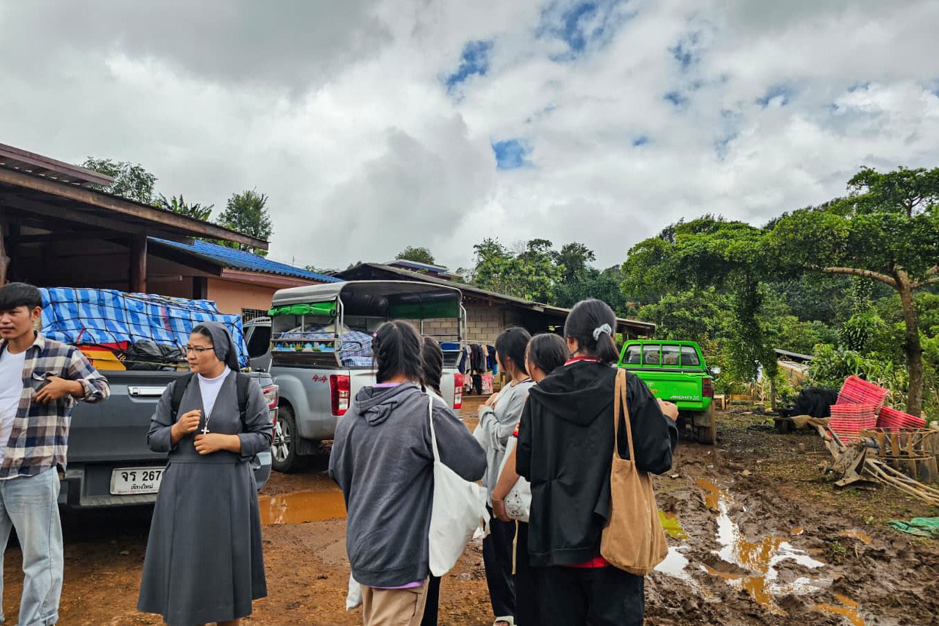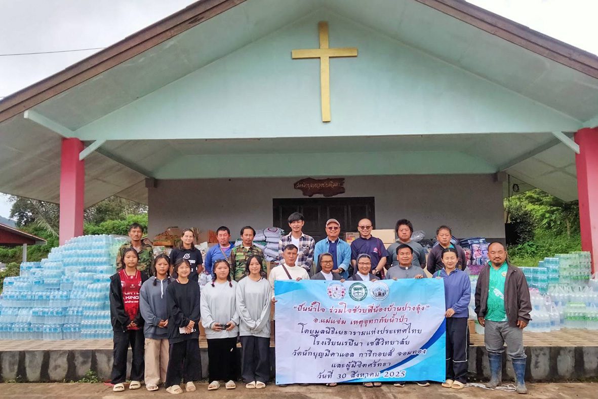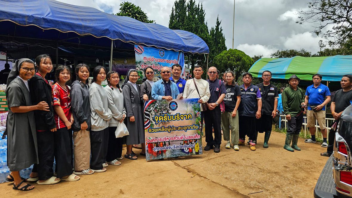 No dia 30 de agosto, as Irmãs Salesianas, juntamente com cinco estudantes do grupo Thida Rak que vivem e estudam na Comunidade São José, cujas famílias estão entre as pessoas atingidas pelo desastre em Ban Pang Ung, chegaram às zonas devastadas junto aos Padres Betharramitas e aos sacerdotes da Diocese de Chiang Mai. Apesar das dificuldades no transporte – um caminhão quebrou e outro não conseguiu subir os trechos mais íngremes da estrada – a missão foi bem-sucedida e conseguiram transferir as cargas e distribuir ajudas no ambulatório do vilarejo, na escola e na igreja de São João Batista, coração da comunidade católica local.