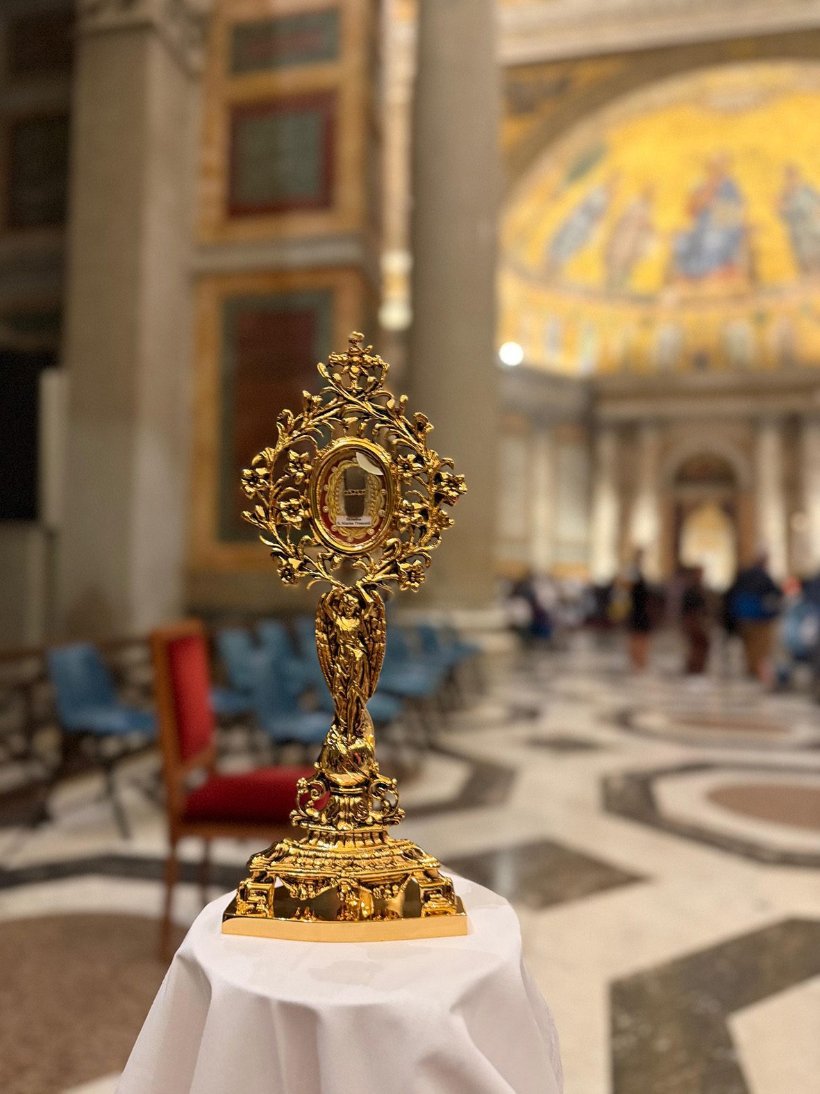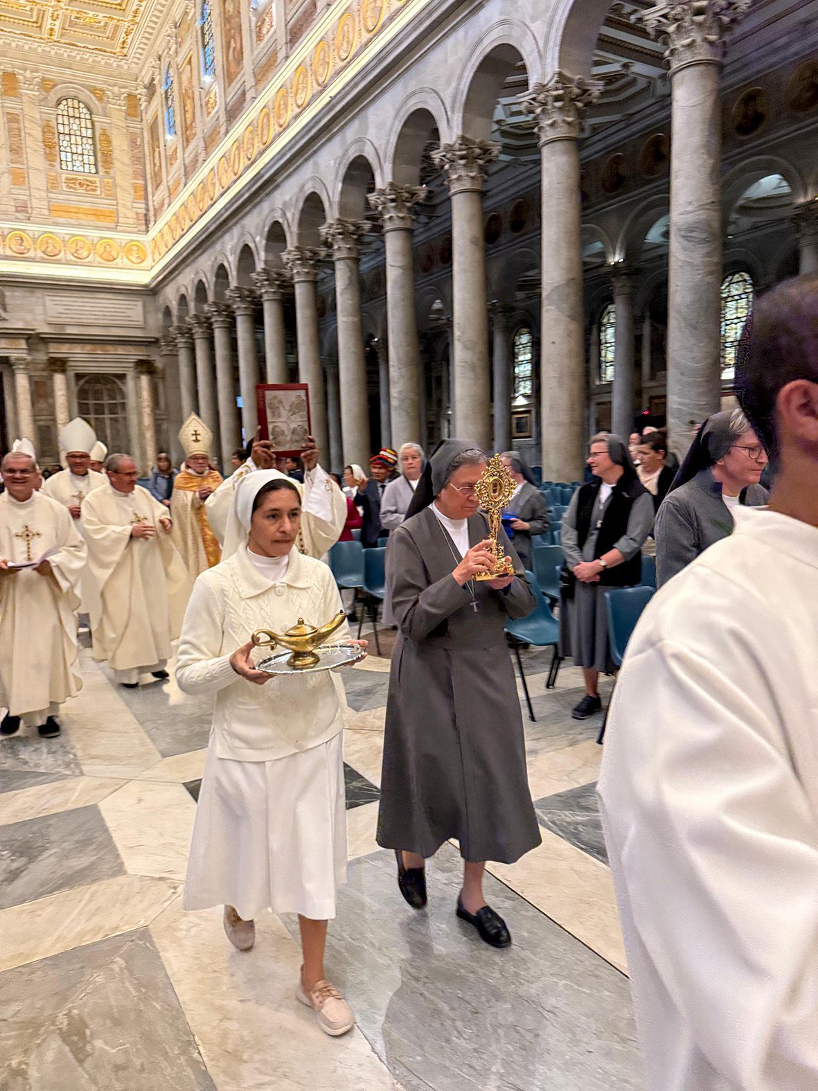 À noite, na Basílica Papal de São Paulo Fora dos Muros, o grupo viveu o último e importante momento de agradecimento, unindo-se à alegria da Igreja universal para celebrar a santidade de Irmã Maria Troncatti, no ano jubilar da Esperança, com a Celebração Eucarística presidida pelo Cardeal Ángel Fernández Artime e concelebrada pelo Reitor-Mor, Pe. Fabio Attard, pelo Reitor-Mor emérito, Pe. Pascual Chávez Villanueva, pelo Postulador, Pe. Pierluigi Cameroni, por Dom Néstor Vidal Montesdeoca Becerra, SDB, Vigário Apostólico de Méndez (Equador), por Dom Pierantonio Tremolada, Bispo de Brescia, pelos Diretores Salesianos do Equador e outros sacerdotes SDB.