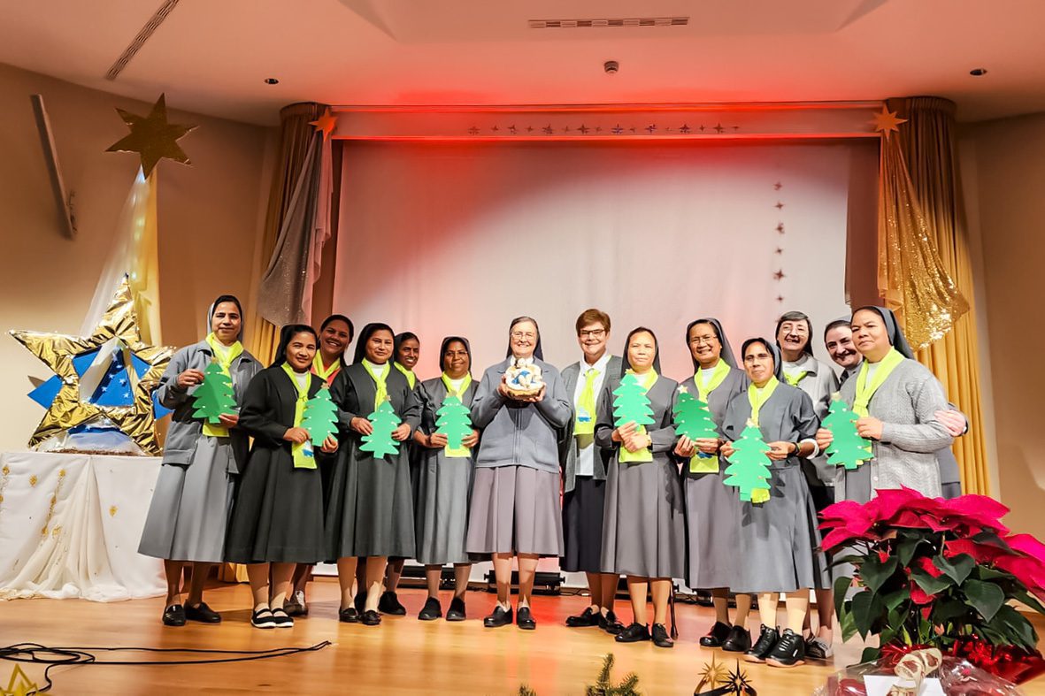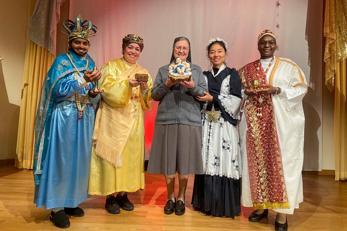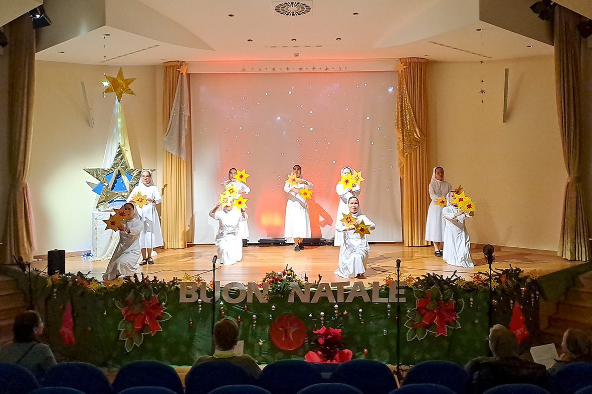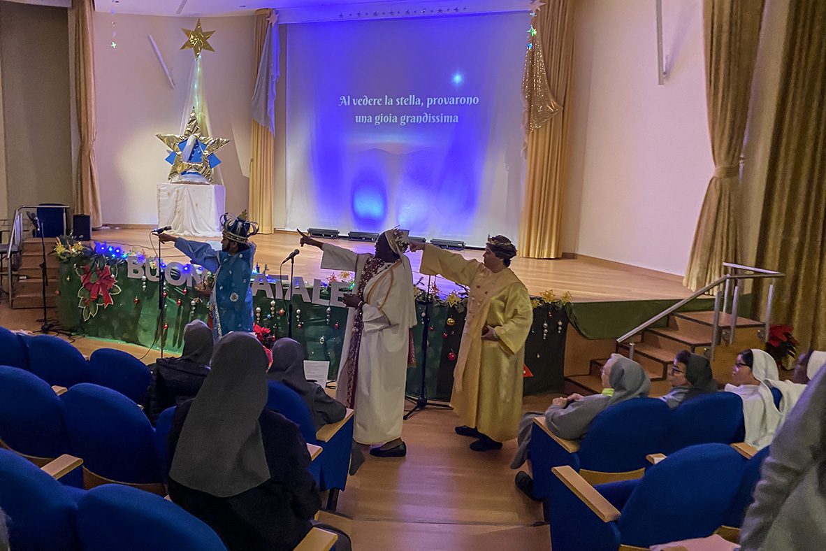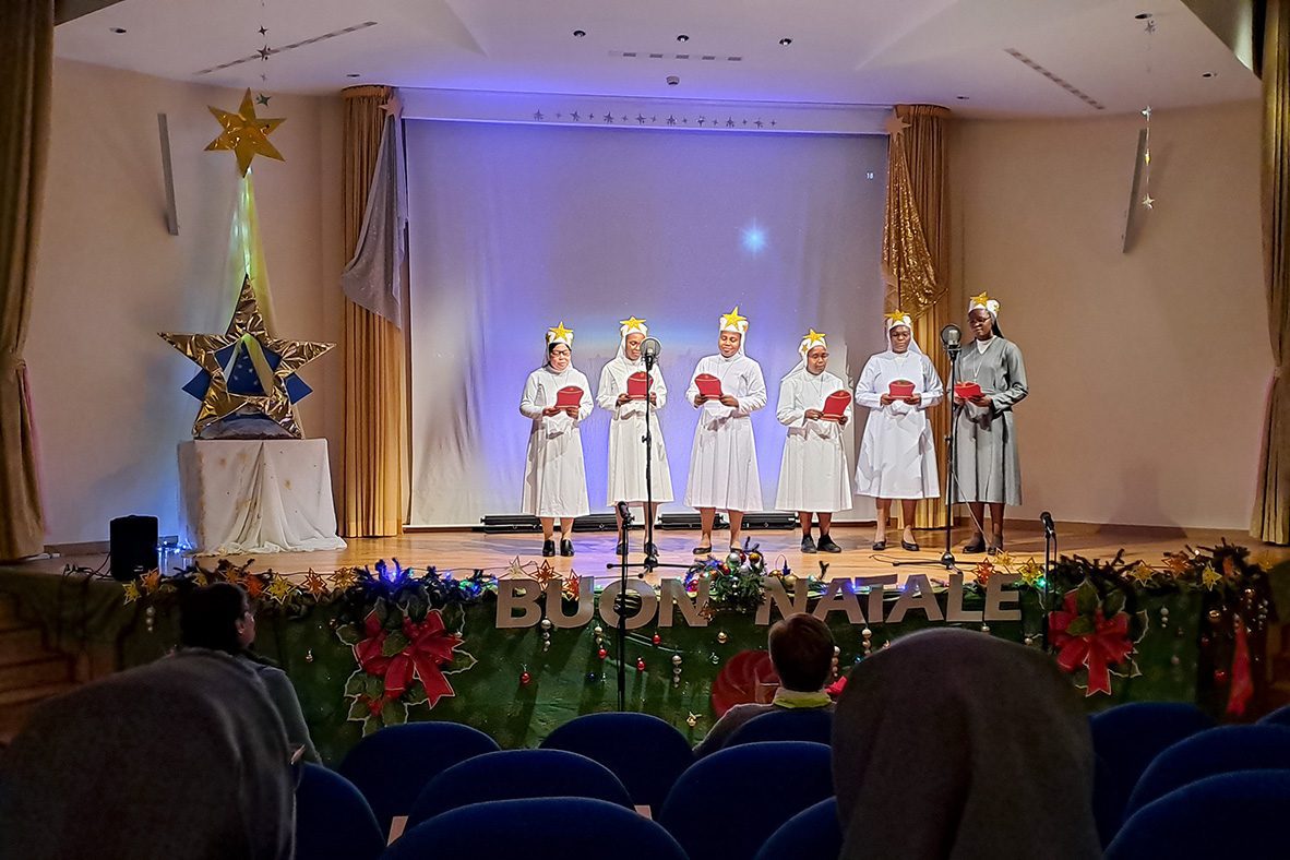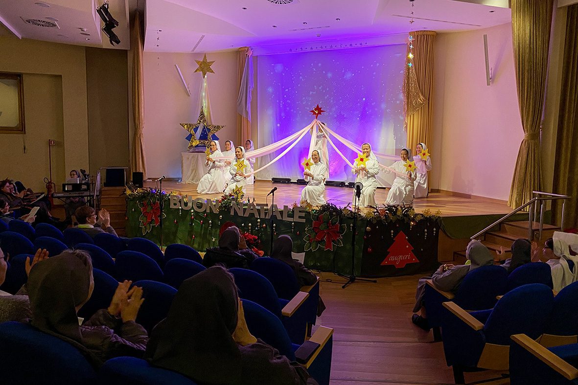 Roma (Itália). No dia 24 de dezembro de 2025, no salão-teatro da sede central do Instituto das Filhas de Maria Auxiliadora, as Comunidades Maria Auxiliadora da Casa Geral (RCG) e Sagrado Coração da Inspetoria romana São João Bosco (IRO) reuniram-se para expressar os votos natalinos à Madre, Irmã Chiara Cazzuola, e às Conselheiras gerais.
