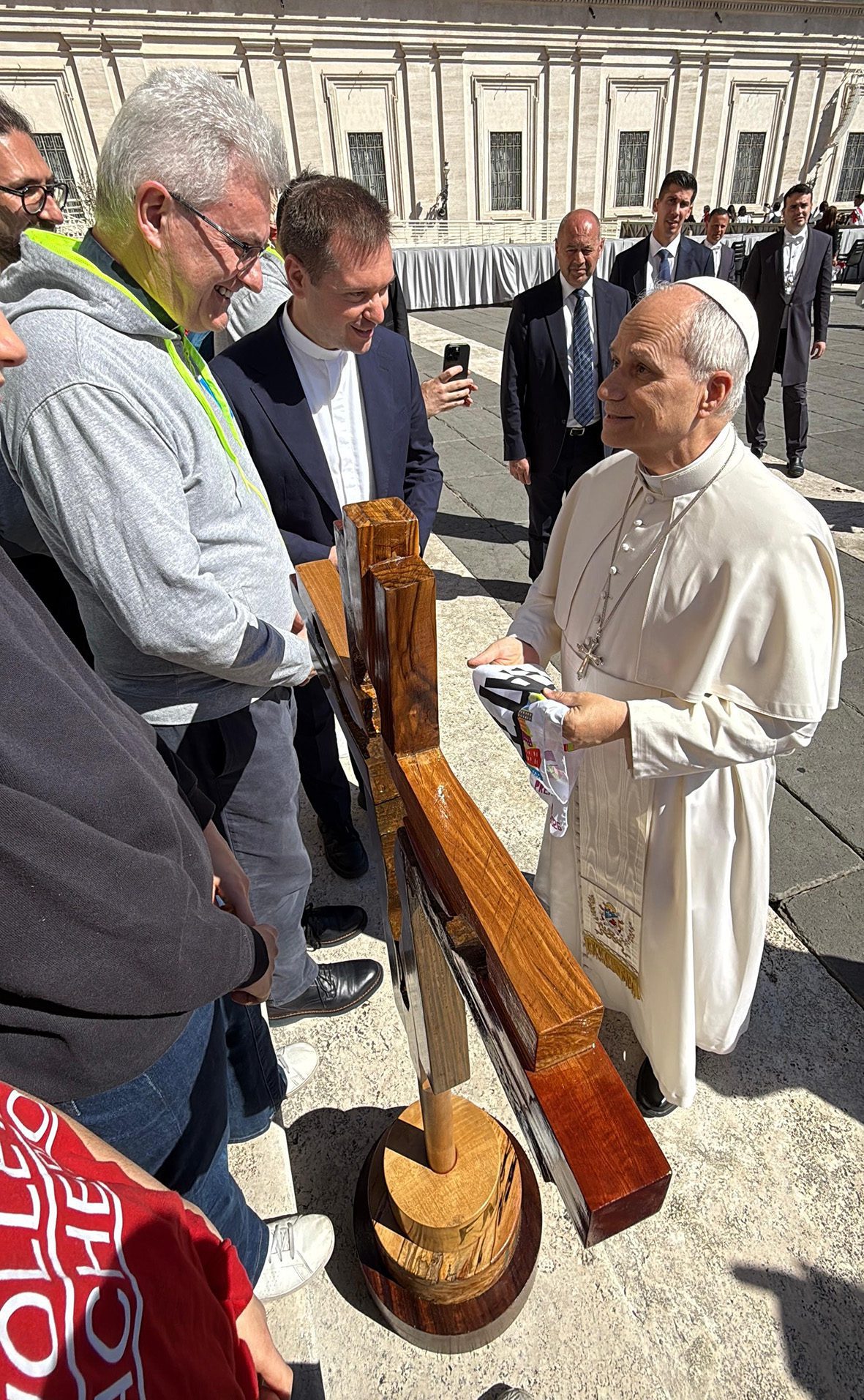 No final da audiência, a delegação da Fundação Oratórios Milaneses (FOM), com o presidente, padre José Como, e o diretor, padre Stefano Guidi, devolveu ao Santo Padre a cruz dos esportistas, que havia sido confiada à Diocese ambrosiana por ocasião dos Jogos Olímpicos de Inverno.