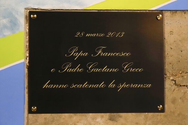 Seguiu-se o momento propriamente dito da inauguração, em que Alberto Mochi Onori e o Cardeal Baldassarre Reina descerraram a placa para não esquecer o início desse sonho: “28 de março de 2013 – Papa Francisco e Padre Gaetano Greco desencadearam a esperança”. No muro externo do cárcere para menores foi projetado o documentário de Edoardo Iacolucci dedicado ao nascimento do mural, enquanto os jovens protagonistas relembraram as etapas do projeto.
