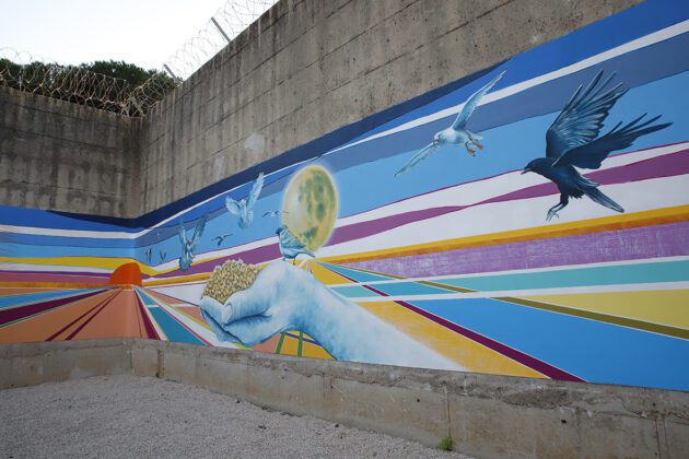 Os jovens queriam gaivotas: criei um grande voo de pássaros diversos — aves de rapina, pardais, mergulhadeiras do mar, corvos, gaivotas, andorinhas — que se alimentam e encontram direção para um abraço, o sujeito principal do mural. Duas pessoas acenderam a centelha de uma vida futura para esses jovens. Sobre a fábrica de massas, voam andorinhas, símbolo de primavera e renovação: o futuro lhes pertence”.