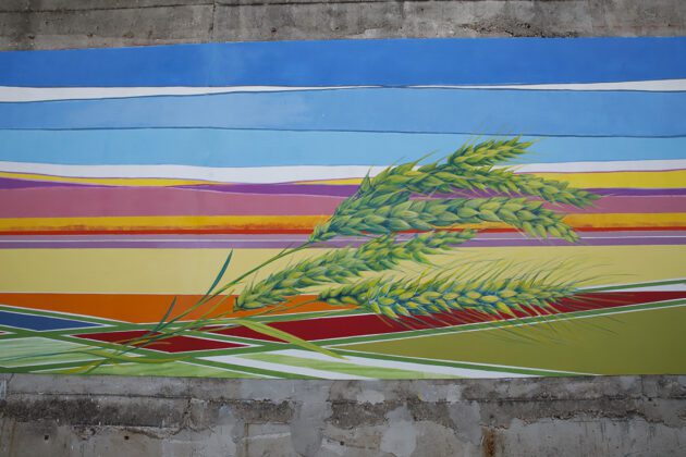 A artista, Giovanna Alfeo, contou as emoções vividas durante a criação da obra, pela qual se sentiu profundamente provocada e envolvida: “Quando cheguei, este muro maciço me perturbou. Pediam que eu o ‘derrubasse’ com cor e desenho. Não achei certo: os limites às vezes nos salvam; além do limite há o abismo. Pensei numa janela longuíssima para uma paisagem outra, geométrica, com elementos figurativos simbólicos: a história do grão, o grão que morre e germina, a espiga que a natureza oferece à mão humana.